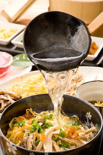 蒸しささ身を裂いたもの・煮干し椎茸・錦糸玉子を定番の具として、地鶏のスープと、干し椎茸のもどし汁に酒と淡醤油で薄味をつけた熱々の汁をご飯に張って具を乗せて食べます。